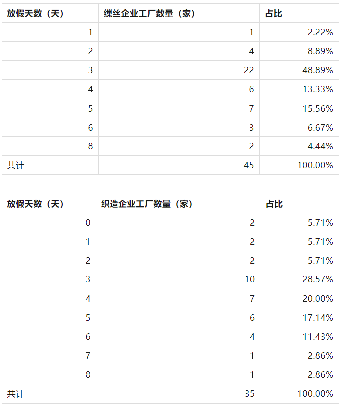 在織造企業(yè)中,放假3-5天的工廠最多,相對(duì)繅絲企業(yè)有些分化。