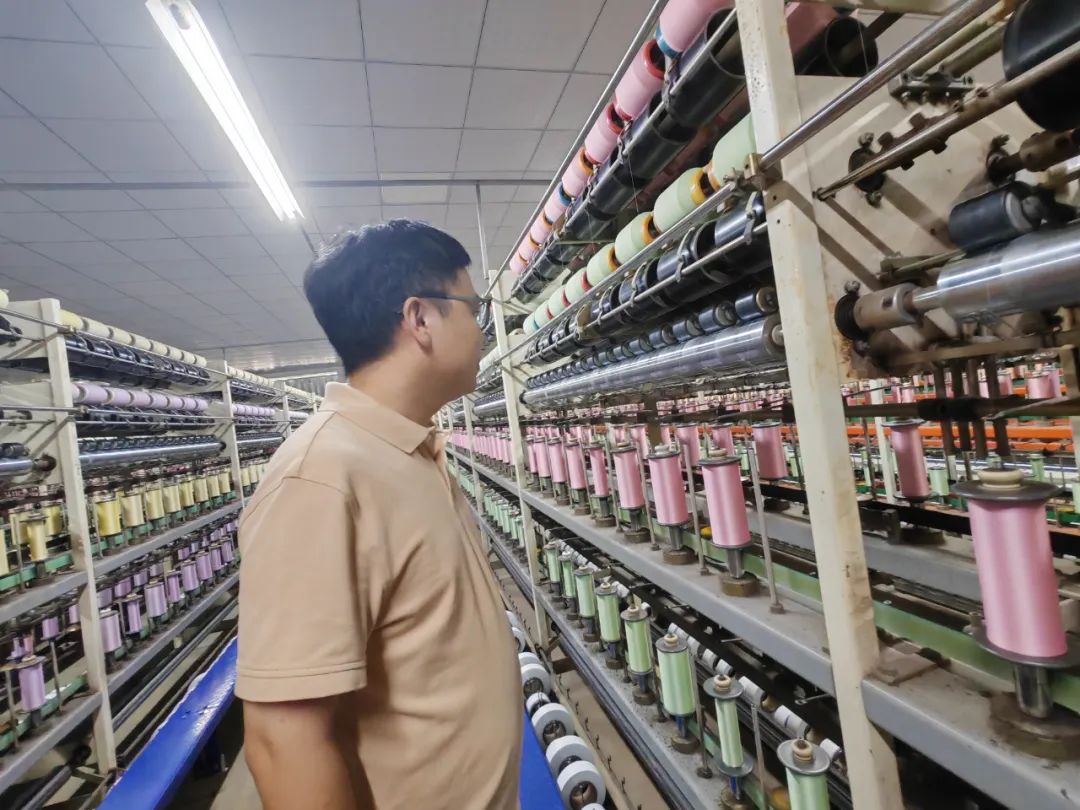 廠房的三樓,進(jìn)行包覆絲和加捻絲加工生產(chǎn),二樓進(jìn)行絡(luò)絲和并絲,一樓則負(fù)責(zé)織造。對于這樣的廠房布局,顧驍杰特別提到其中的優(yōu)勢: