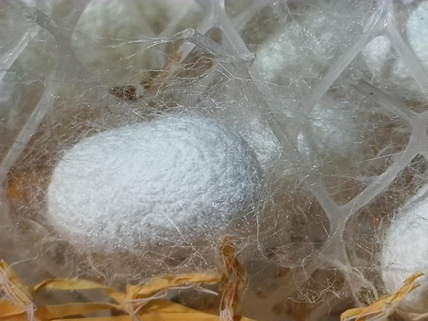 進入蠶房,一股熱氣撲來,這里面的溫度是22攝氏度,在這個溫度下,蠶28天左右就可以結繭,再向蠶房里面走,很多類似“上下鋪”的蠶床,這是蠶寶吃飯、睡覺、結繭的場所,蠶床上面的綠色葉子便是桑葉,是它們的食物,在蠶床兩邊黃色網(wǎng)格上堆放的白色橢圓體,這就是蠶繭,仔細聽還會聽見蠶啃食桑葉發(fā)出“沙沙”的聲響。