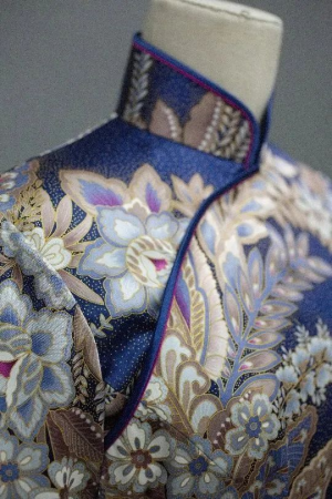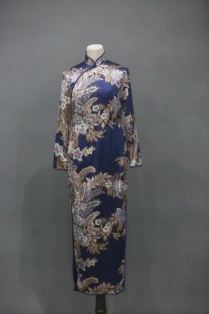 據(jù)悉,林會長此次捐贈的藍(lán)地花卉紋緞面旗袍曾在其私人聚會中穿著,旗袍面料來自上海,由香港手工旗袍師傅劉安慶設(shè)計制作。劉安慶入行制作旗袍近60年,《花樣年華》《2046》《一代宗師》等多部電影都使用了他的作品。