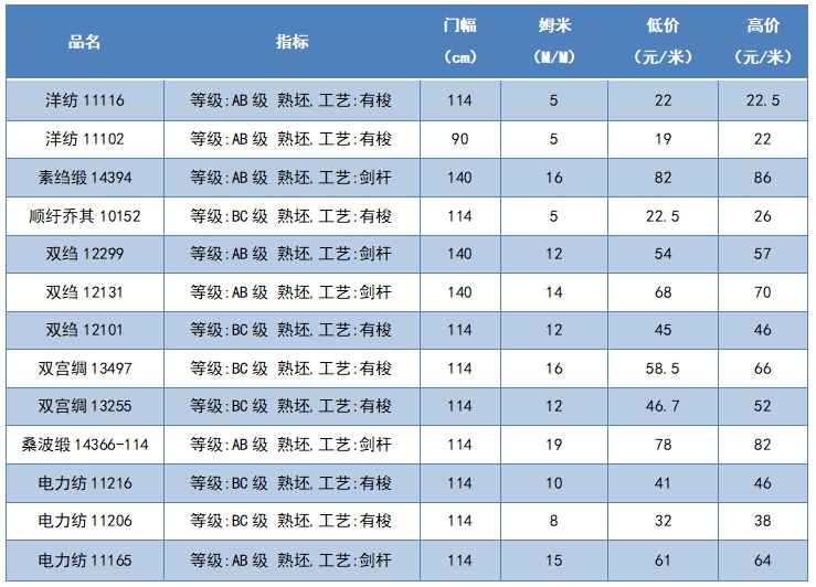 本周綢緞指數(shù)協(xié)作單位成交價格區(qū)間