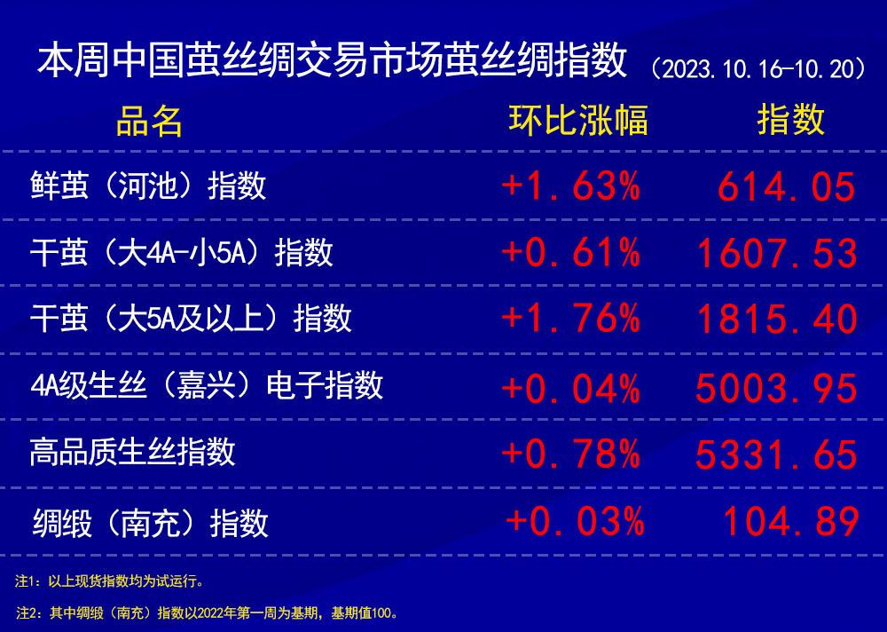 【今日現(xiàn)貨電子交易價格】今日(2023年10月20日,周五)中國繭絲綢交易市場生絲指數(shù)下跌0.16%收于5003.95點,本周生絲指數(shù)微漲0.04%。B絲(商檢4A級生絲):231025合約下跌0.15萬元報收于49.95萬元;240325合約下跌0.15萬元報收于50.79萬元;240925合約下跌0.09萬元報收于48.96萬元。