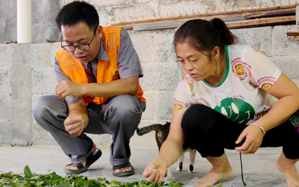 時宜公司工作人員幫助蠶農(nóng)鄧金秋檢查四齡蠶的生長情況