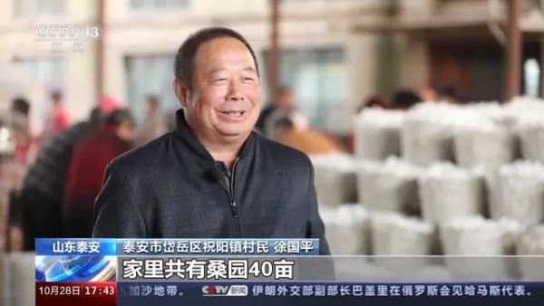 泰安市岱岳區(qū)祝陽鎮(zhèn)村民 徐國平:家里共有桑園40畝,一年能收四季,按照今年平均27塊錢一斤計(jì)算,光養(yǎng)蠶全年的收入有20多萬元。