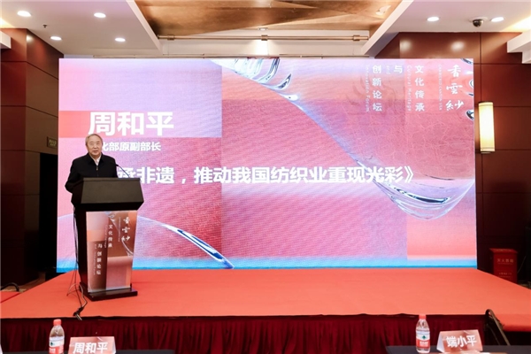 周和平圍繞論壇主題,以《傳承非遺,推動我國傳統(tǒng)紡織業(yè)重放光彩》為主題發(fā)言,周部長從宏觀角度,深入淺出的闡明了非遺從業(yè)者塑造文化自信,發(fā)掘東方文化價值的策略與路徑,深入挖掘歷史文化資源、推動非遺的創(chuàng)造性轉(zhuǎn)化和創(chuàng)新性發(fā)展、加大與相關(guān)產(chǎn)業(yè)融合力度、擴大傳統(tǒng)紡織企業(yè)產(chǎn)品的對外合作與貿(mào)易來發(fā)揮文化資源優(yōu)勢,使傳統(tǒng)紡織業(yè)重放光彩,為非遺文化的傳承創(chuàng)新工作提升了思想高度。