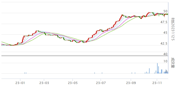 今日(2023年11月23日,周四)中國繭絲綢交易市場生絲指數(shù)下跌0.23%收于4971.56點(diǎn)。B絲(商檢4A級生絲):231125合約下跌0.03萬元報(bào)收于49.65萬元;240325合約下跌0.09萬元報(bào)收于50.79萬元;240925合約下跌0.15萬元報(bào)收于48.99萬元。今日盤面A絲合約價(jià)格繼續(xù)小幅上漲。