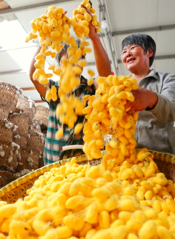 一直以來,市農(nóng)業(yè)農(nóng)村局大力支持蠶桑產(chǎn)業(yè)創(chuàng)新發(fā)展,聚焦家蠶種質資源保護和新品種選育。由市農(nóng)科院蠶桑所自主育成的天然金黃繭新品種“水星1號”,具有繭色鮮艷穩(wěn)定、強健好養(yǎng)、繭絲質性狀優(yōu)良的特點,于2019年通過了浙江省農(nóng)作物品種審定委員會審定。近年來,天然金黃繭蠶品種在全國各地累計飼養(yǎng)推廣已達5萬張,蠶農(nóng)養(yǎng)金黃繭每擔蠶繭繭價提高100~300元,增幅10~15%,增產(chǎn)增收十分明顯。