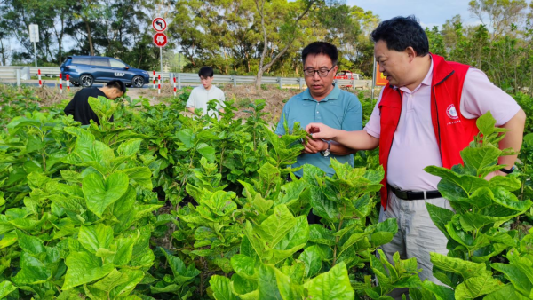 圖為劉吉平教授團隊在廣西國色天蠶發(fā)展有限公司標準桑園示范基地了解桑樹病蟲害發(fā)生情況