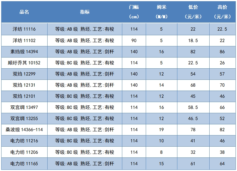 本周綢緞指數(shù)協(xié)作單位成交價格區(qū)間