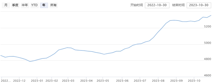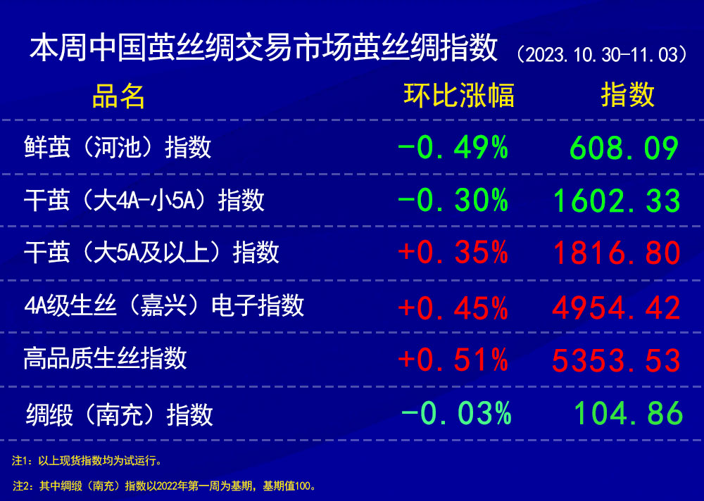 本周生絲電子指數(shù)累計上漲0.45%報收于4954.42點?,F(xiàn)貨月231125生絲合約貼近現(xiàn)貨實際,本周累計上漲0.73%。