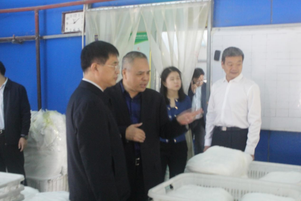 馬冰一行在盧福堂的陪同下參觀了公司制綿5車間、延展車間。盧福堂就民興生物目前的生產(chǎn)經(jīng)營狀況、產(chǎn)品產(chǎn)能情況、絲膠蛋白的研發(fā)進展、企業(yè)的進出口業(yè)務(wù)、轉(zhuǎn)板上市進程及公司的主題教育開展情況向領(lǐng)導(dǎo)一行做了詳細匯報。馬冰對絲膠蛋白的發(fā)展前景非??春?,指出要繼續(xù)加大研發(fā)力度,早日實現(xiàn)量產(chǎn),在民興生物科技創(chuàng)新發(fā)展中成為一個新的科技創(chuàng)新點、突破點。同時對企業(yè)的進出口業(yè)務(wù)提出了詳細的指導(dǎo)性建議。