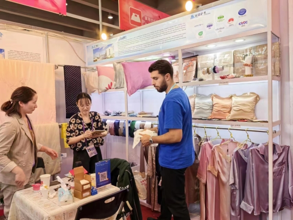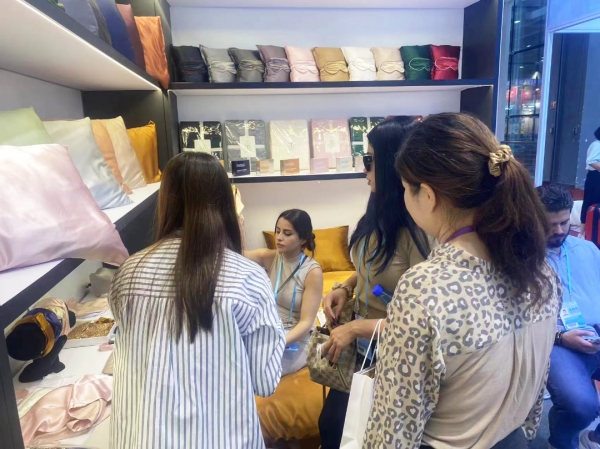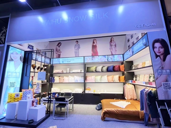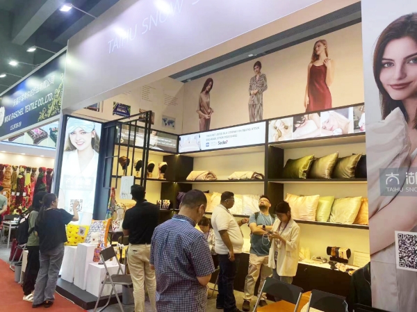 據(jù)曹玲介紹,太湖雪帶去了蠶絲被、真絲套件、真絲眼罩、真絲睡衣等產(chǎn)品?!捌渲?,最受歡迎的是真絲眼罩、發(fā)圈等絲綢飾品,客戶可以通過個(gè)性化、時(shí)尚化、年輕化的絲綢飾品感受真絲面料的絲滑觸感和奢華體驗(yàn)?!辈芰岜硎?,2023年以來,太湖雪致力于實(shí)施“中國制造+品牌出?!睉?zhàn)略,此次參展將有利于太湖雪進(jìn)一步提升品牌知名度和國際競爭力,擴(kuò)大海外客戶朋友圈。