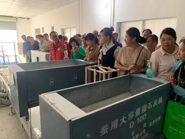 圖為農(nóng)技人員現(xiàn)場講解自動化喂蠶設(shè)施