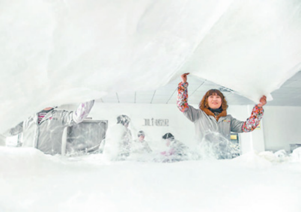 絲綢車間內(nèi),工人在拉蠶絲被