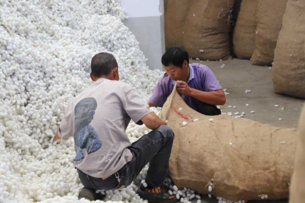 收購(gòu)點(diǎn)工人將蠶繭裝袋