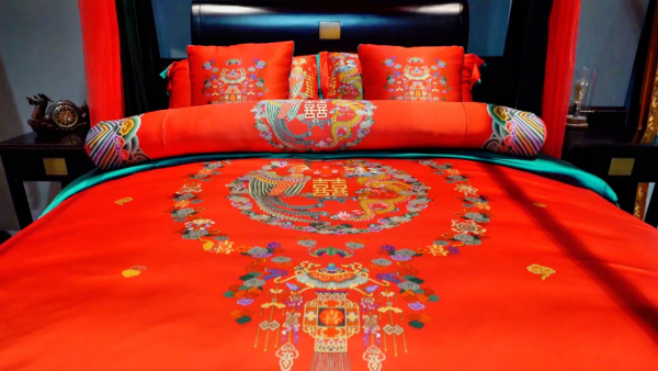 山西潞安府潞綢集團品牌部經理劉朵霞介紹:“我們潞安府主打產品是‘新娘潞綢被’,主要有手繡、織錦、印花和提花四大系列。這套潞綢被設計靈感來源于故宮坤寧宮的喜字和龍鳳。在圖案上弘揚傳承了傳統(tǒng)文化,媽媽們特別喜歡。同時,紅配綠這樣的配色,也受到了年輕人的青睞。”