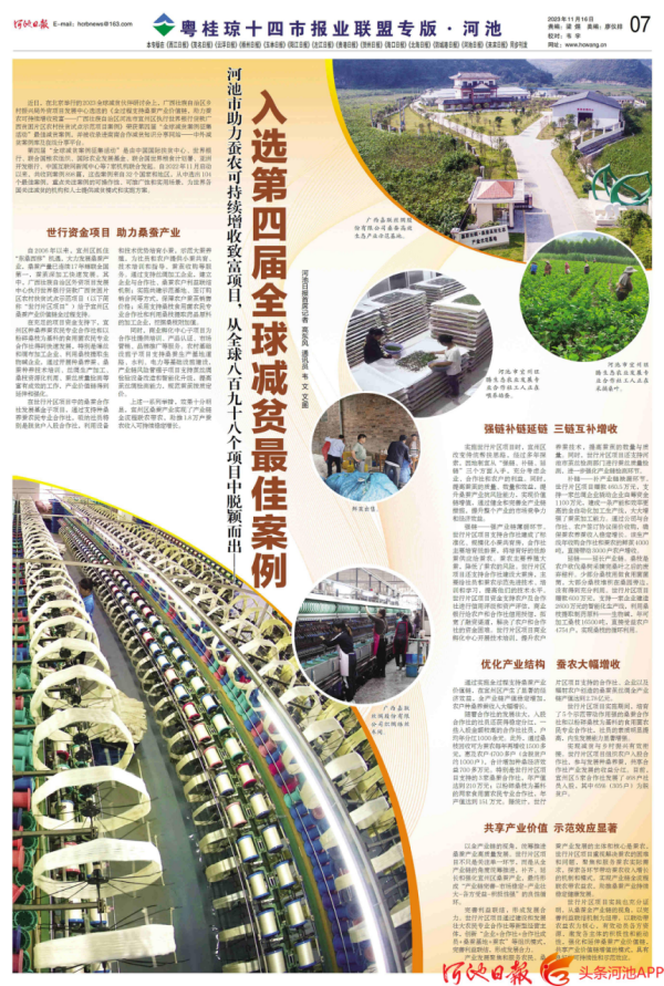 近日,在北京舉行的2023全球減貧伙伴研討會(huì)上,廣西壯族自治區(qū)鄉(xiāng)村振興局外資項(xiàng)目發(fā)展中心選送的《全過(guò)程支持桑蠶產(chǎn)業(yè)價(jià)值鏈,助力蠶農(nóng)可持續(xù)增收致富——廣西壯族自治區(qū)河池市宜州區(qū)執(zhí)行世界銀行貸款廣西貧困片區(qū)農(nóng)村扶貧試點(diǎn)示范項(xiàng)目案例》榮獲第四屆“全球減貧案例征集活動(dòng)”最佳減貧案例,并被收錄進(jìn)南南合作減貧知識(shí)分享網(wǎng)站——中外減貧案例庫(kù)及在線(xiàn)分享平臺(tái)。