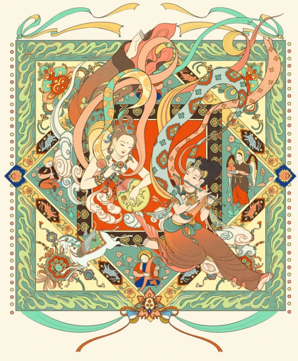 2023年絲綢之路周系列文創(chuàng)插畫設(shè)計以敦煌藻井、飛天為框架,設(shè)計素材參考主題展覽“文明大觀:絲綢之路上的敦煌”展品。如飛天披帛參考敦煌莫高窟出土紡織品中的絲綢紋樣,繪制了祥云、團花等紋飾。兩位飛天一位手持中國傳統(tǒng)樂器笛子,一位手持16世紀匈牙利樂器,和諧共奏本屆絲路周主題“絲路同行 互鑒共贏”。