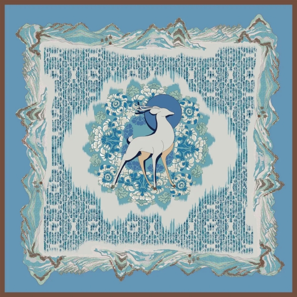 此款絲巾靈感來自敦煌壁畫藝術(shù)和中國絲綢藝術(shù),國絲立獅寶花紋錦,本身就是東西方文化交流的結(jié)晶,而敦煌壁畫中的九色鹿從寶花環(huán)中穿越,正意味著國絲與敦煌的穿越之合,四周的青綠山水更是象征敦煌藝術(shù)的長青、絲綢遺產(chǎn)的長青和雙方合作的長青。