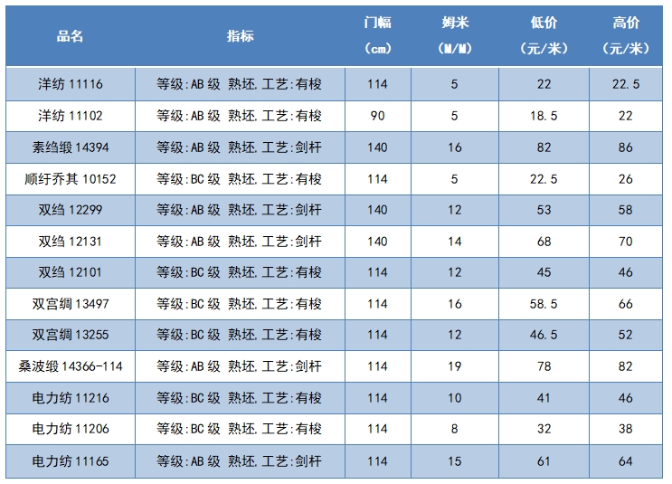 本周綢緞指數(shù)協(xié)作單位成交價格區(qū)間