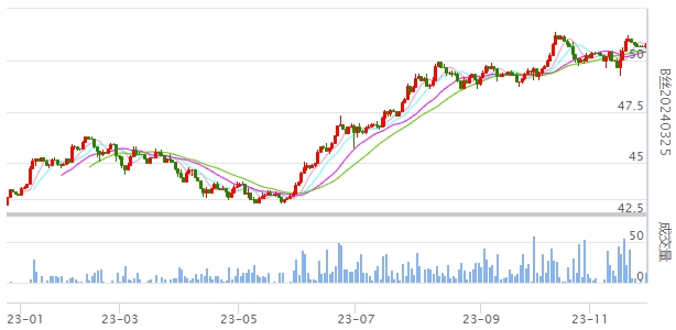 今日(2023年11月29日,周三)中國繭絲綢交易市場生絲指數(shù)上漲0.09%收于4972.64點。B絲(商檢4A級生絲):231225合約報平收于49.83萬元;240325合約上漲0.06萬元報收于50.73萬元;240925合約上漲0.27萬元報收于49.14萬元。今日代表高品質(zhì)生絲的A絲盤面部分合約有所小幅拉漲。