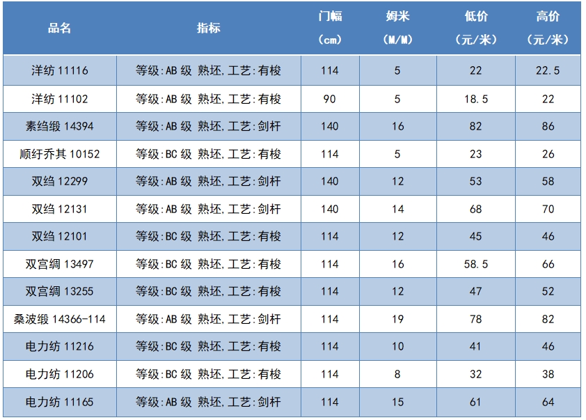 本周綢緞指數(shù)協(xié)作單位成交價格區(qū)間