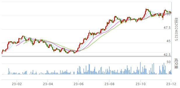 今日(2023年12月01日,周五)中國繭絲綢交易市場生絲指數(shù)微跌0.01%收于4974.61點,本周生絲指數(shù)微跌0.02%。B絲(商檢4A級生絲):231225合約下跌0.06萬元報收于49.77萬元;240325合約上漲0.06萬元報收于50.61萬元;240925合約上漲0.06萬元報收于49.17萬元。