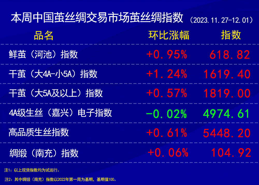干繭指數(shù)上,本周采樣基本是干繭貿(mào)易??壗z企業(yè)抓緊時間購進干繭儲備生產(chǎn)原料。兩個等級的干繭指數(shù)環(huán)比上周有所上漲。