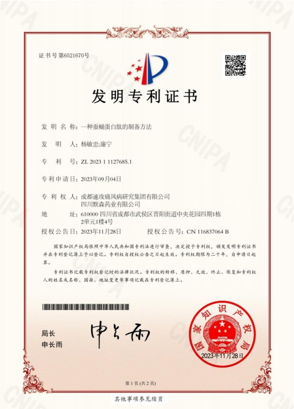 “樂至素有立桑為業(yè)的傳統(tǒng),我們開展相關研究,不僅可以幫助企業(yè)自身開辟發(fā)展新領域的新賽道,還可以通過把科技創(chuàng)新優(yōu)勢轉(zhuǎn)化為高質(zhì)量發(fā)展優(yōu)勢,助力樂至現(xiàn)代蠶桑業(yè)強勢崛起!”為此,樂至縣蠶桑產(chǎn)業(yè)創(chuàng)新聯(lián)合體牽頭單位四川默森藥業(yè)有限公司研發(fā)團隊和成都大學食品工程學院、成都速攻痛風病研究集團有限公司專家團隊共同攻堅克難,攻克了靶向酶解關鍵技術工藝,成功地在桑蠶蛹里分離提取出了4.5~5kDa范圍內(nèi)的高純度高活性小分子蛋白肽。試驗證明,該蛋白肽成分不僅可以用在保健食品中提升人體免疫力,還可以對大腸桿菌、金黃色葡萄球菌、啤酒酵母菌的抗菌率均大于95%,具有較好的抗菌活性。此外,經(jīng)過大量的動物模型、毒理、穩(wěn)定性和生物相容性試驗,驗證了經(jīng)修飾的蠶蛹蛋白肽具有優(yōu)良的抗菌性、抗炎性、抗氧化效果和極好的安全性。該研究項目,獲得了國家知識產(chǎn)權局頒發(fā)的發(fā)明專利證書,并成功入選資陽市“揭榜掛帥”重大科技項目。