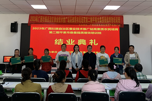 近日,由廣西壯族自治區(qū)蠶業(yè)技術(shù)推廣站主辦的2023年高素質(zhì)農(nóng)民培育(宜州、平果)桑蠶提質(zhì)增效培訓(xùn)班先后結(jié)業(yè),培訓(xùn)學(xué)員101名。廣西蠶業(yè)技術(shù)推廣站相關(guān)負(fù)責(zé)人出席平果培訓(xùn)班的結(jié)業(yè)典禮。