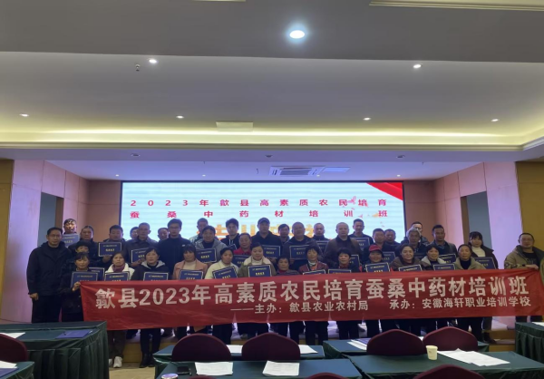11月30日,由安徽省歙縣農(nóng)業(yè)農(nóng)村局主辦、安徽海軒職業(yè)培訓(xùn)學(xué)校承辦的2023高素質(zhì)農(nóng)民蠶桑中藥材培訓(xùn)班在歙縣維也納酒店順利舉行了結(jié)業(yè)典禮,縣農(nóng)業(yè)農(nóng)村局科教辦公室李瑛、科教股股長潘忠華以及來自歙縣的50名學(xué)員參加此次典禮。