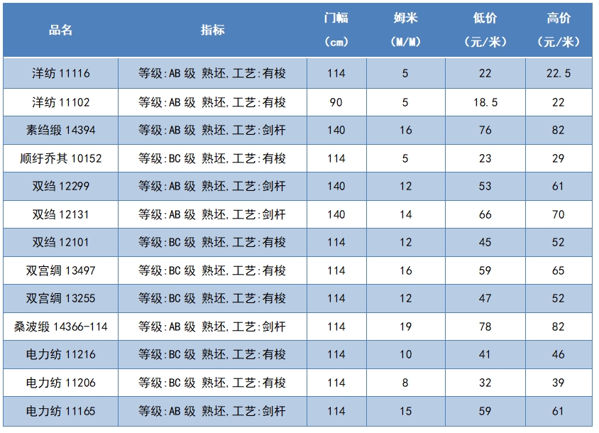 本周綢緞指數(shù)協(xié)作單位成交價格區(qū)間