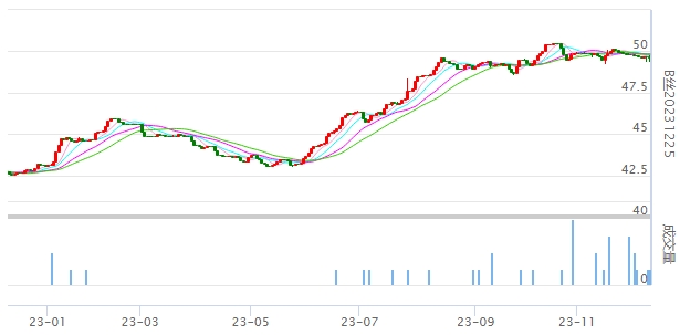 今日(2023年12月11日,周一)中國繭絲綢交易市場生絲指數(shù)微漲0.15%收于4971.69點。B絲(商檢4A級生絲):231225合約下跌0.03萬元報收于49.65萬元;240325合約上漲0.03萬元報收于50.58萬元;240925合約上漲0.06萬元報收于49.17萬元。