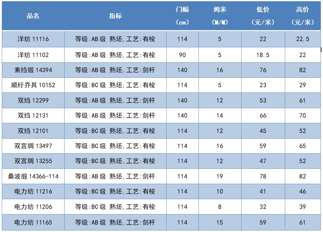 本周綢緞指數(shù)協(xié)作單位成交價(jià)格區(qū)間