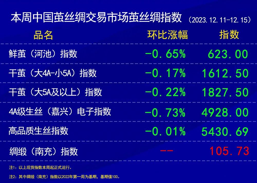 本周中國(guó)繭絲綢交易市場(chǎng)繭絲綢指數(shù)