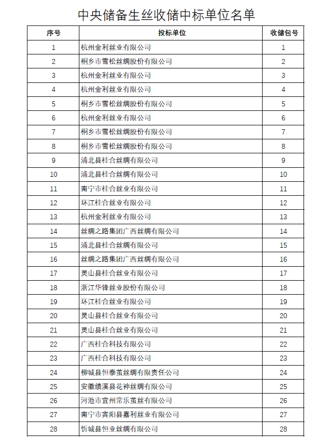 今日,根據(jù)程序,生絲收儲(chǔ)中標(biāo)企業(yè)名單公布。