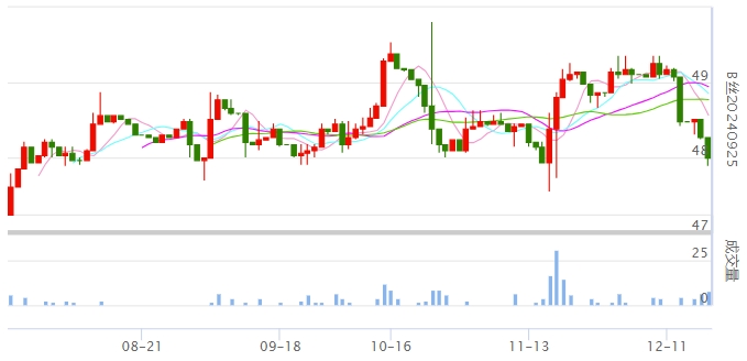今日(2023年12月19日,周二)中國(guó)繭絲綢交易市場(chǎng)生絲指數(shù)下跌0.34%收于4890.09點(diǎn)。B絲(商檢4A級(jí)生絲):231225合約下跌0.06萬(wàn)元報(bào)收于49.08萬(wàn)元;240325合約下跌0.36萬(wàn)元報(bào)收于49.35萬(wàn)元;240925合約下跌0.27萬(wàn)元報(bào)收于48.00萬(wàn)元。