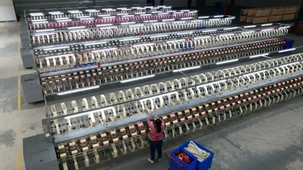 近日,記者一行走進三江口(忻城)繭絲綢產(chǎn)業(yè)園一期項目車間,只見一條條生產(chǎn)線有序排列,一臺臺紡織設(shè)備不停運轉(zhuǎn),從繅絲、絡(luò)絲、并絲、倍捻到倒筒,一根根白色絲線在自動化生產(chǎn)線上快速穿梭,車間工人各司其職,現(xiàn)場一派繁忙景象。