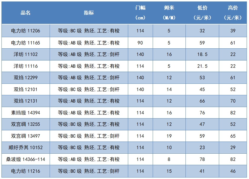 本周綢緞指數(shù)協(xié)作單位成交價(jià)格區(qū)間