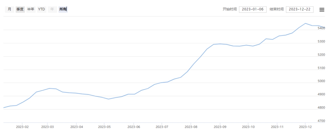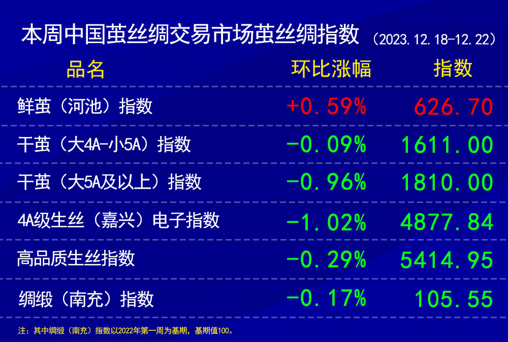 高品質(zhì)生絲指數(shù)上,本周協(xié)作單位持續(xù)年末的走貨特點(diǎn),走勢(shì)相對(duì)平靜,價(jià)格指數(shù)環(huán)比上周略下跌。