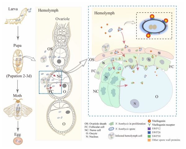 長久以來,養(yǎng)蠶業(yè)一直受到微粒子病的嚴(yán)重危害。早在750多年前,我國現(xiàn)存最早的官修農(nóng)書《農(nóng)桑輯要》就記載了家蠶微粒病問題,提出淘汰病蛾、選留完好蠶種的防治辦法。19世紀(jì),家蠶微粒子病在法國大流行,嚴(yán)重?fù)p害了法國蠶業(yè)發(fā)展。1865至1869年,“微生物學(xué)之父”路易·巴斯德(Louis Pasteur)受當(dāng)時政府指派,前往法國南部解決微粒子病難題,建立了母蛾鏡檢法防治該病,此法仍沿用至今。家蠶微粒子病之所以難以防治,其根本原因是該病的病原——家蠶微粒子蟲(Nosema bombycis)能夠侵染宿主(家蠶、棉鈴蟲和斜紋夜蛾等鱗翅目昆蟲)的卵母細(xì)胞,導(dǎo)致子代卵先天帶毒(故有“蠶的艾滋病”之稱)。因此,家蠶微粒子蟲成為蠶種生產(chǎn)過程中的唯一法定檢疫對象。然而,該病原是如何侵入家蠶卵母細(xì)胞的呢?這是蠶業(yè)科學(xué)領(lǐng)域的一個百年科學(xué)命題。