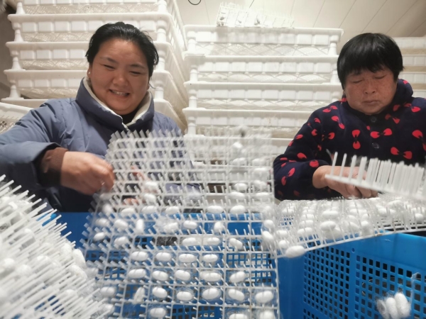 冬季試養(yǎng)成功,蠶兒不吃桑葉吃飼料,工廠自動化養(yǎng)殖一到四齡期,五齡期后分包給農戶,一年四季天天可以養(yǎng),開辟了養(yǎng)蠶新模式,實現(xiàn)公司、農戶共贏。鑫緣繭絲綢集團股份有限公司副董事長常務副總經(jīng)理孫道權表示,企業(yè)規(guī)劃一戶老百姓養(yǎng)兩到三張紙,每個月可以養(yǎng)3批,老夫妻倆在家每個月的收入就可以達到4000至5000元。