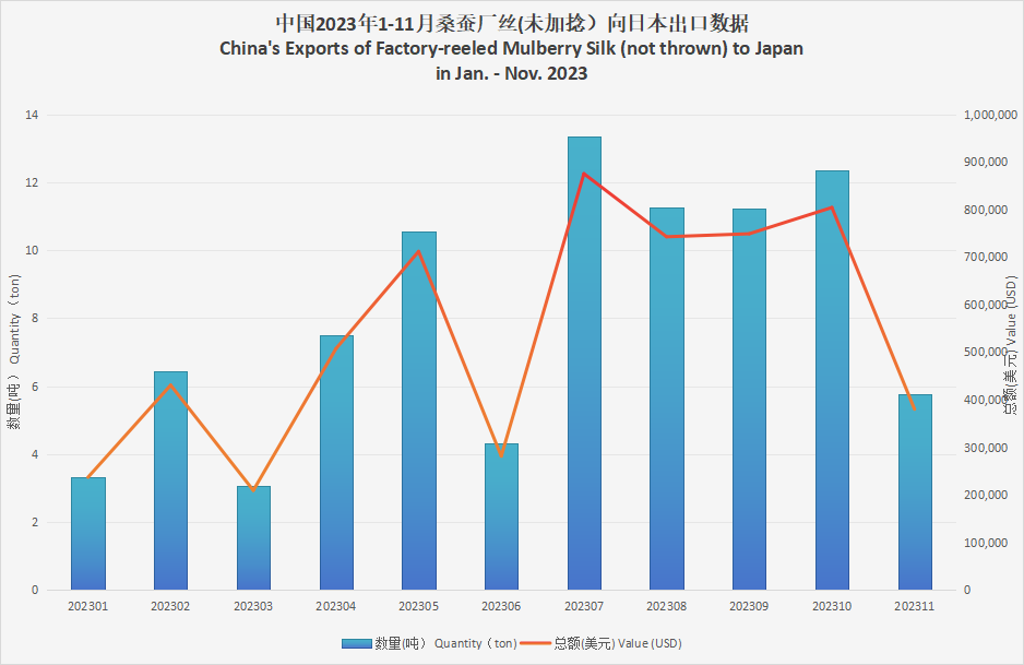 根據(jù)中國海關數(shù)據(jù),我國2023年1-11月桑蠶廠絲出口日本總額約為592.9萬美元,數(shù)量約為89.127噸。出口平均單價為6.65萬美元/噸。數(shù)據(jù)僅為HS50020011項下出口統(tǒng)計,不包括整個絲類。