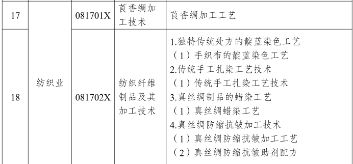 紡織相關(guān)限制出口部分:獨特傳統(tǒng)處方的靛藍(lán)染色工藝:手織布的靛藍(lán)染色工藝,傳統(tǒng)手工扎染工藝技術(shù),真絲綢制品的蠟染工藝,真絲綢防縮抗皺加工技術(shù):(1)真絲綢防縮抗皺加工工藝(2)真絲綢防縮抗皺助劑配方,古代絲織品復(fù)制技術(shù),碳纖維加工技術(shù),用于航天器殼體的纖維增強(qiáng)樹脂基復(fù)合材料生產(chǎn)技術(shù)……(詳見附件)