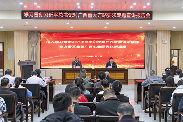 報(bào)告會(huì)上,林樹(shù)恒緊扣“深入學(xué)習(xí)貫徹習(xí)近平總書(shū)記視察廣西重要講話(huà)精神奮力譜寫(xiě)壯美廣西農(nóng)業(yè)現(xiàn)代化新篇章”的主題,從“必須把推進(jìn)中國(guó)式現(xiàn)代化作為最大的政治,奮力譜寫(xiě)中國(guó)式現(xiàn)代化廣西篇章;牢牢把握高質(zhì)量發(fā)展和構(gòu)建新發(fā)展格局的重大任務(wù),加快構(gòu)建現(xiàn)代化產(chǎn)業(yè)體系;把推進(jìn)鄉(xiāng)村全面振興作為新時(shí)代新征程‘三農(nóng)’工作的總抓手”等方面,深刻闡述了習(xí)近平總書(shū)記對(duì)廣西重大方略要求的重大意義、豐富內(nèi)涵和實(shí)踐要求。