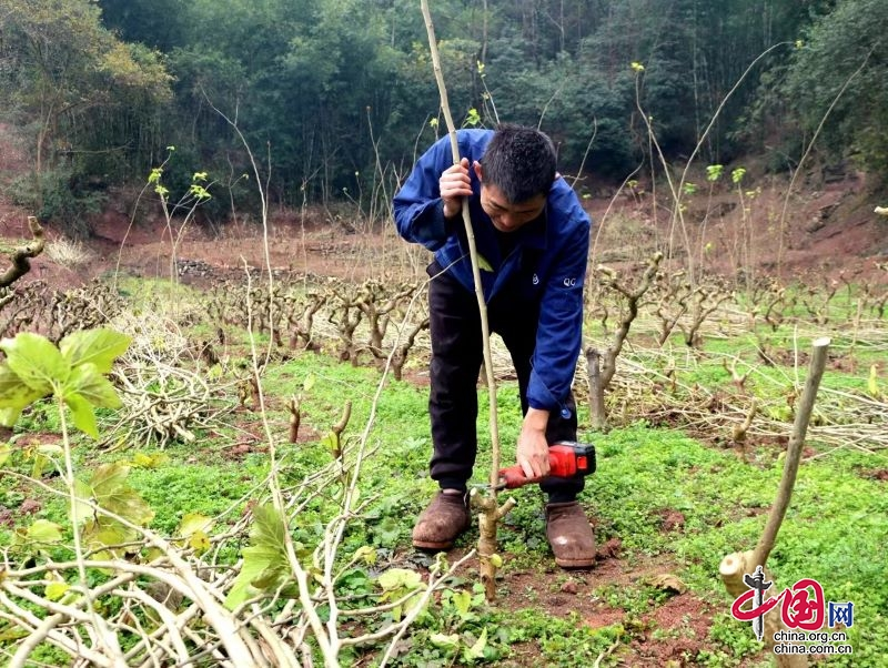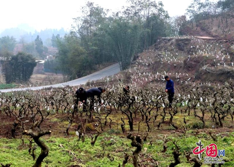 1月3日,在高縣可久鎮(zhèn)紅意村桑園內(nèi),該鎮(zhèn)蠶技人員正在指導(dǎo)蠶農(nóng)搶抓晴好天氣進(jìn)行桑樹“刷白”作業(yè)。