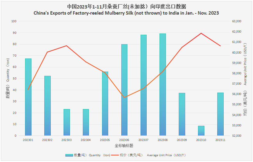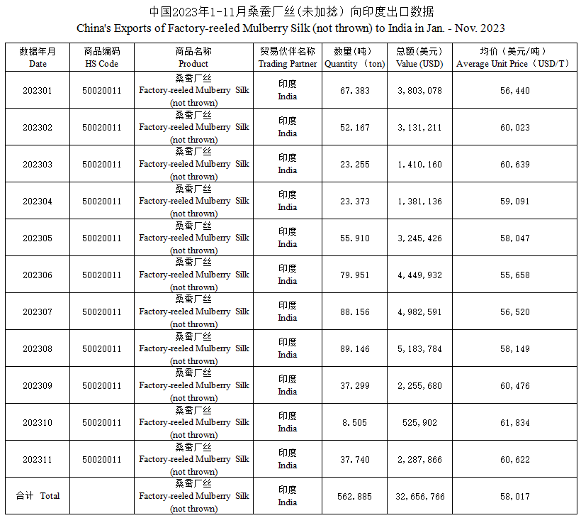 根據(jù)中國(guó)海關(guān)數(shù)據(jù),我國(guó)2023年1-11月桑蠶廠絲出口印度總額約為3265.6766萬(wàn)美元,數(shù)量約為562.885噸。出口平均單價(jià)為5.8017萬(wàn)美元/噸。數(shù)據(jù)僅為HS50020011項(xiàng)下出口統(tǒng)計(jì),不包括整個(gè)絲類(lèi)。