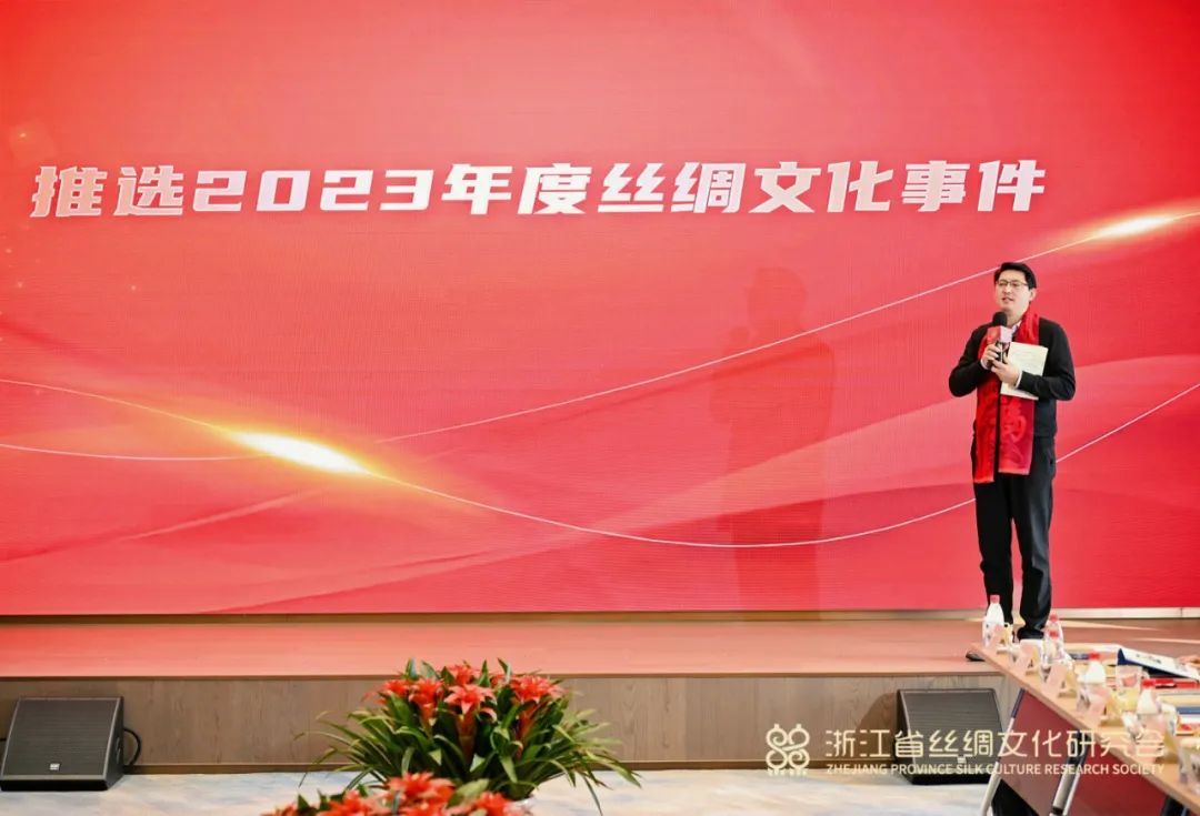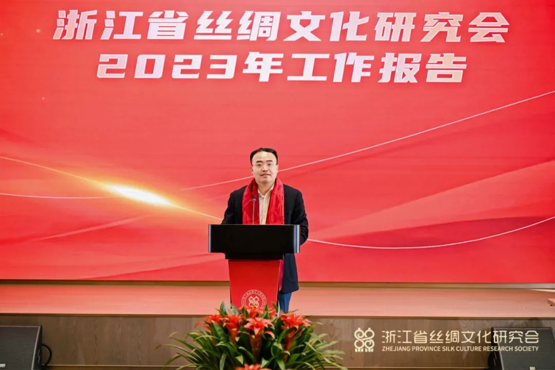 浙江省絲綢文化研究會秘書長滕俊楷向會議作了工作報告;浙江省絲綢文化研究會副會長、國際絲綢聯(lián)盟秘書長、《絲綢》雜志總編輯李啟正介紹了2023 年度絲綢文化事件推選情況。