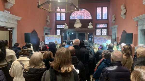 威尼斯市政府副市長保拉·瑪爾,意大利外交部原副部長、威尼斯市原副市長、蘇州榮譽(yù)市民勞拉·芬卡多,中國駐意大利大使館文化處參贊張凌霄,威尼斯大學(xué)校長李集雅、紀(jì)念馬可·波羅國家委員會(huì)成員馬西莫·安德雷奧利、威尼斯莫瑟尼格宮博物館館長琪亞娜·斯夸爾奇納出席開幕式,蘇州市政府副市長查穎冬以視頻方式出席并致辭,蘇州廣電傳媒集團(tuán)(總臺(tái))最新制作的《君到姑蘇見》國際版宣傳片亮相開幕式。