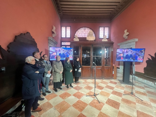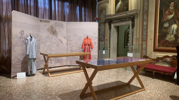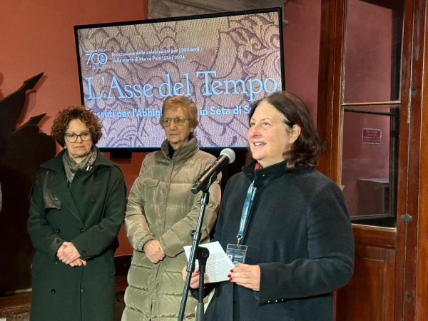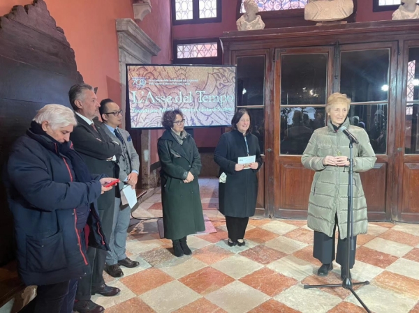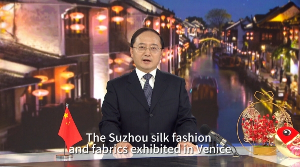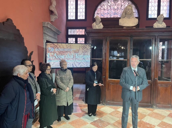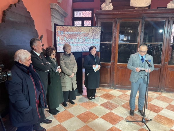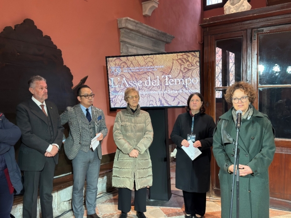 威尼斯當(dāng)?shù)貢r(shí)間1月10日上午,由蘇州市文化廣電和旅游局、蘇州市政府外事辦公室、蘇州廣電傳媒集團(tuán)(總臺(tái))聯(lián)合意大利紀(jì)念馬可·波羅國家委員會(huì)、威尼斯國立博物館基金會(huì)、威尼斯大學(xué)孔子學(xué)院等部門主辦,由蘇州絲綢博物館承辦的“時(shí)間的線——蘇州絲綢服飾面料”特展在威尼斯莫瑟尼格宮博物館舉行開幕儀式。